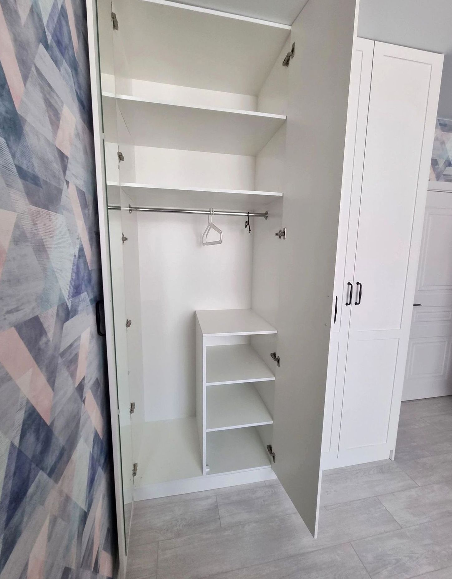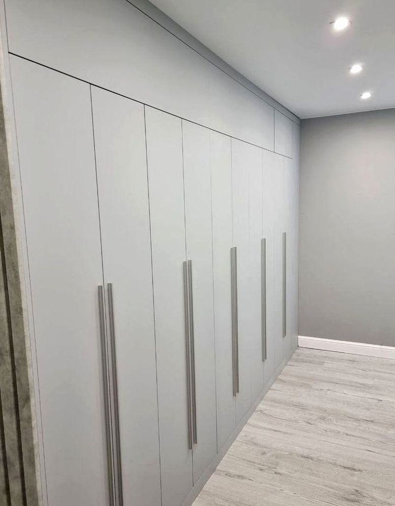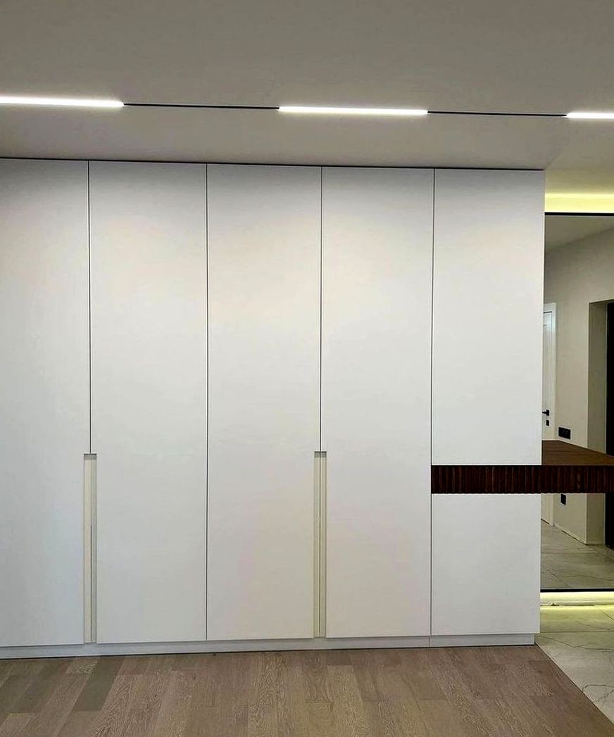 Корпусный шкаф, двери купе, наполнение: полки, штанги, ящики. Визуально расширяет пространство, сохраняет функциональность и порядок