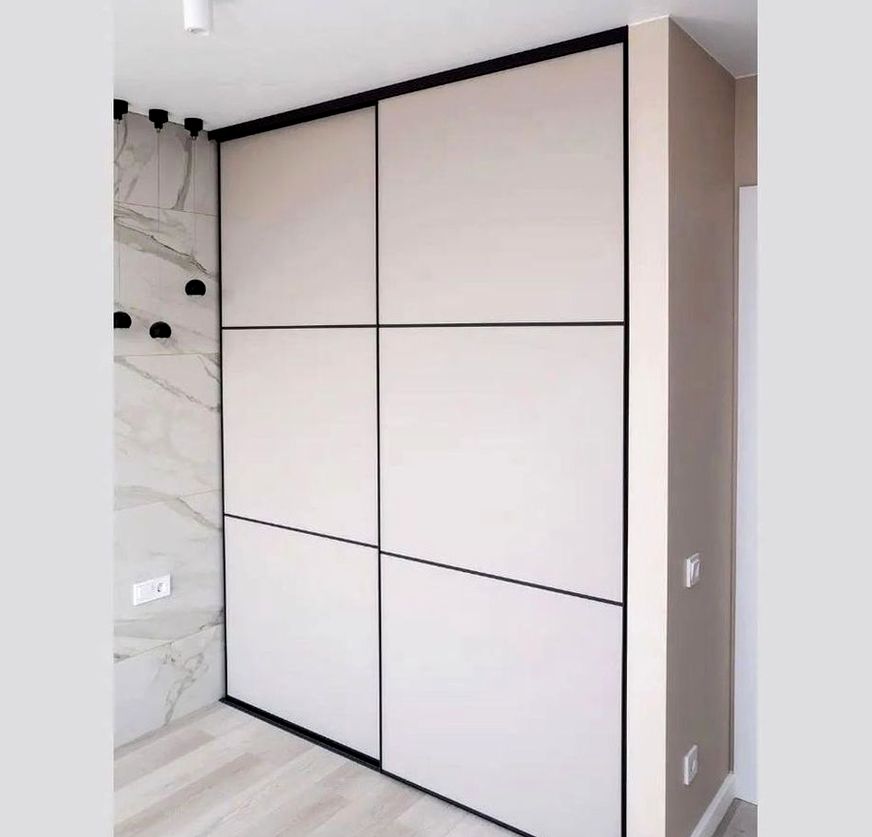 Встроенный шкаф, двери комбинированный, наполнение: секции под одежду, белье, ящики и подсветка. Вместительная система хранения с премиальным внешним видом