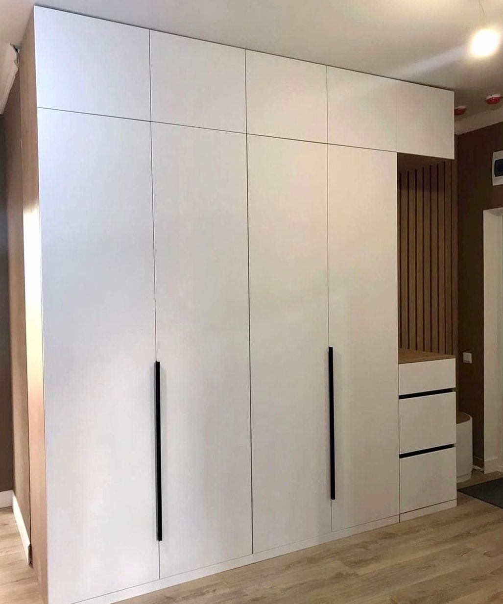 Встроенный шкаф, двери распашной, наполнение: верхняя одежда, обувные секции, антресоль. Практичное хранение для входной зоны, аккуратный и чистый вид