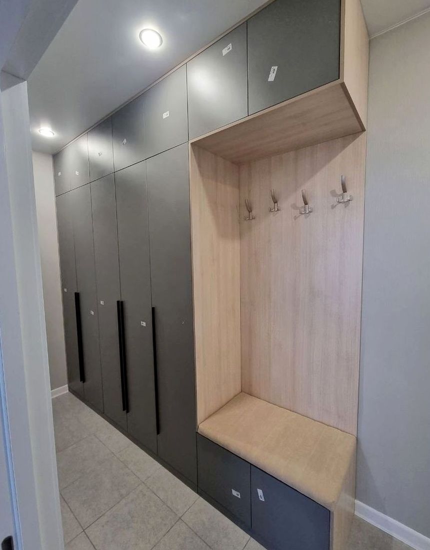 Встроенный шкаф, двери распашной, наполнение: верхняя одежда, обувные секции, антресоль. Практичное хранение для входной зоны, аккуратный и чистый вид