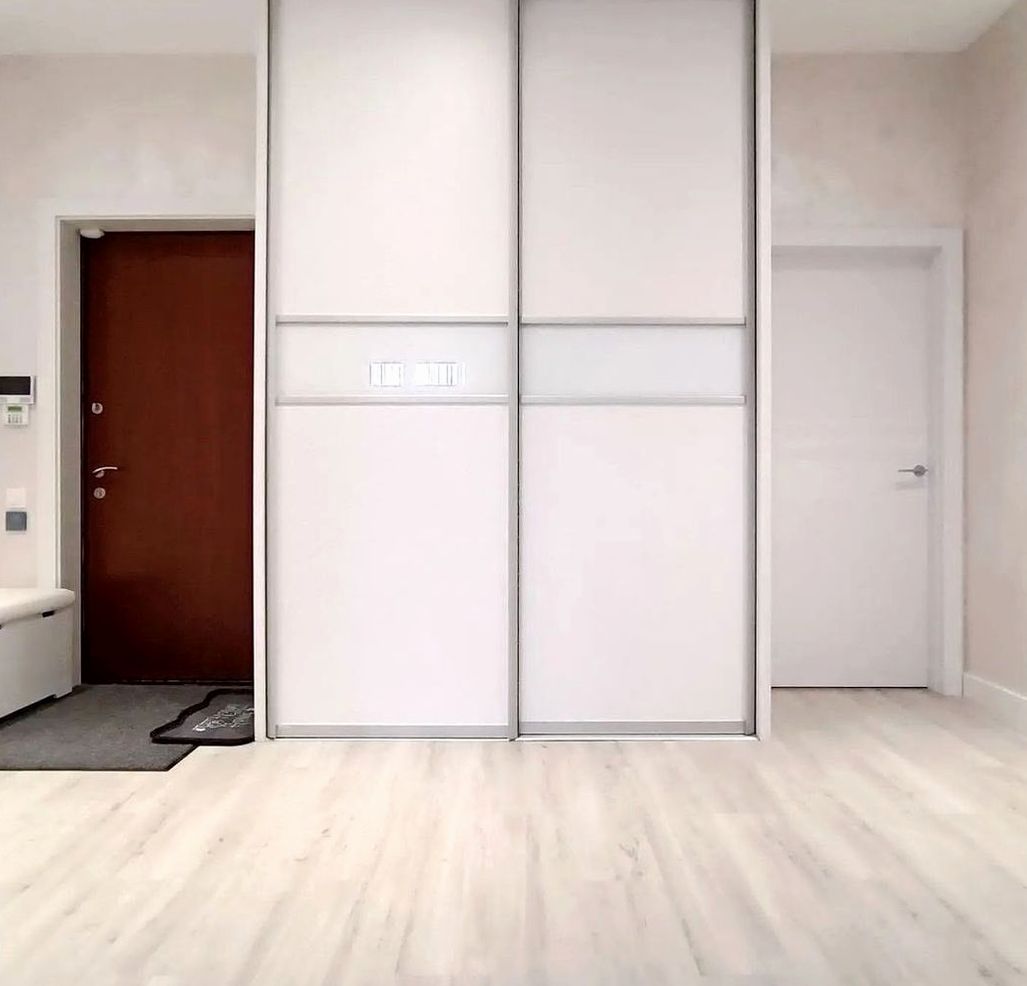 Встроенный шкаф, двери комбинированный, наполнение: секции под одежду, белье, ящики и подсветка. Вместительная система хранения с премиальным внешним видом