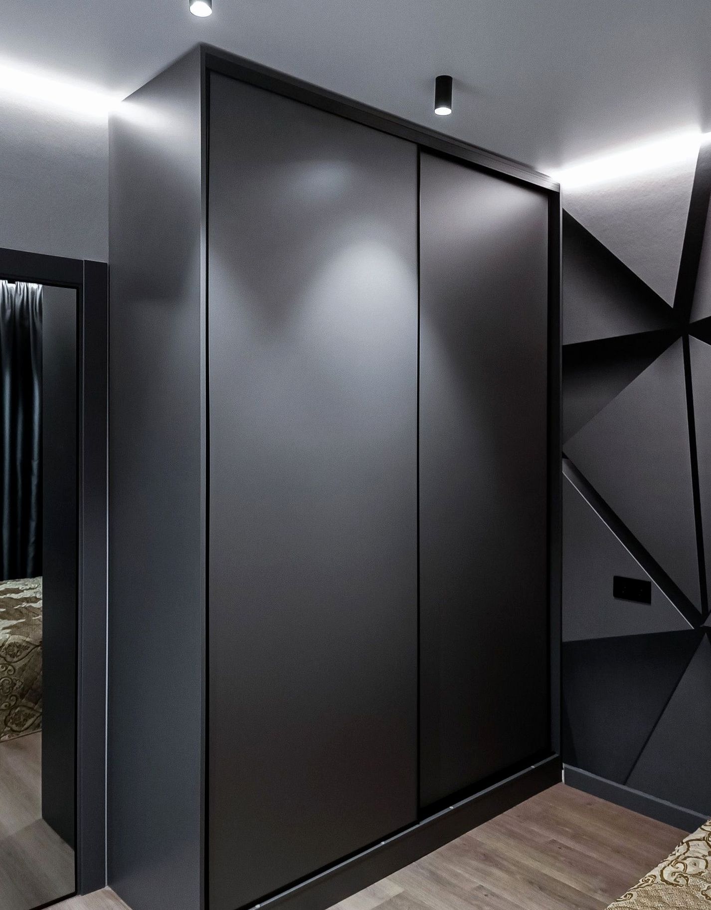 Корпусный шкаф, двери купе, наполнение: полки, штанги, ящики. Визуально расширяет пространство, сохраняет функциональность и порядок